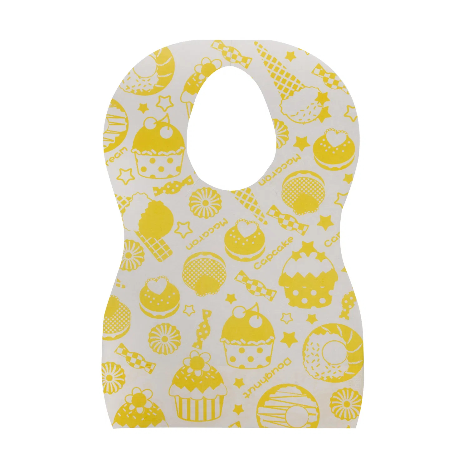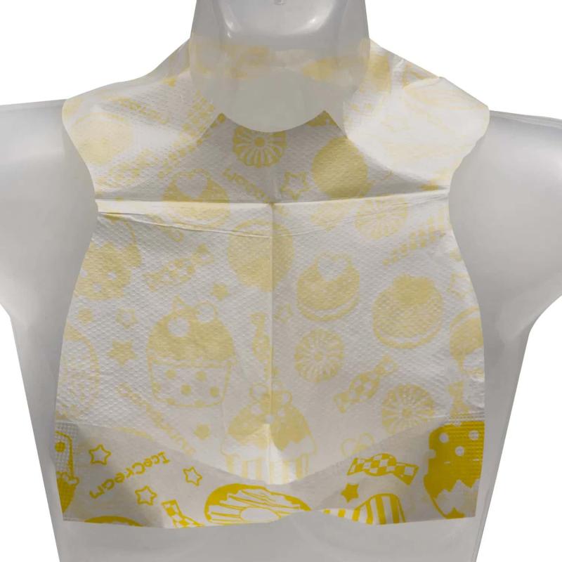 ポケット紙付きの使い捨てベビーエプロン。PE 素材で作られており、防水性があり、複数のパターンを印刷できます。